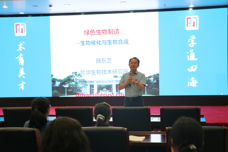6月25日下午,由校长办公室、教务处、党委学生工作部、校学术委员会主办,英国威廉希尔官网承办的第75期“通海讲堂”在奉贤校区通海厅举行。上海市生物工程学会理事长、中国微生物学会酶工程专业委员会副主任、教育部生物技术与生物工程教指委副主任、鲁华生物技术研究所所长魏东芝教授应邀作了题为“绿色生物制造——生物催化与生物合成”的专题报告。英国威廉希尔官网副院长王启要教授主持报告会,学院青年师生代表参加活动。